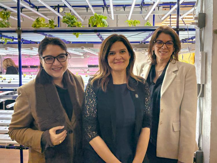 De gauche à droite: Mme Céline Haytayan, députée de Laval-des-Rapides et adjointe parlementaire du ministre de l'Économie, de l'Innovation et de l'Énergie (volets intelligence artificielle, quantique, sciences et innovation), Mme Chantale Nunes, enseignante de biologie et responsable du projet d'infrastructure aquaponique, et Mme Pascale Sirard, directrice générale du Collège de Bois-de-Boulogne.
