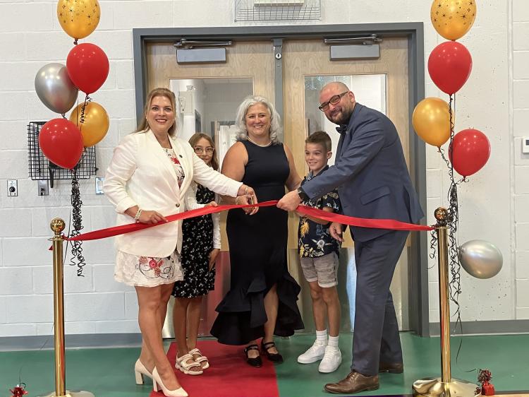 De gauche à droite : Geneviève Hébert (députée de Saint-François et whip adjointe du gouvernement), Léanna Labonté (élève Marie-Reine), Linda Pagé (directrice école Marie-Reine), Tom Lacroix (élève Marie-Reine) et Sylvain Racette ((directeur général CSSRS).