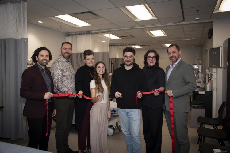 Coupure du ruban en présence de nombreux partenaires internes et externes. De gauche à droite : David Marra-Hurtubise, représentant de la députée de Les Plaines - Lucie Lecours, Joël Bouchard, directeur de la Fondation du Cégep de Saint-Jérôme, Patricia Tremblay, directrice des études, Frédérique D'Amours, enseignante en Techniques d'inhalothérapie, responsable à la coordination du programme et des stages, Kevin Brisebois, étudiant en Techniques d'inhalothérapie, Nadine Le Gal, directrice générale et Xavier-Antoine Lalande, maire de Saint-Colomban et préfet de la MRC de La Rivière-du-Nord.